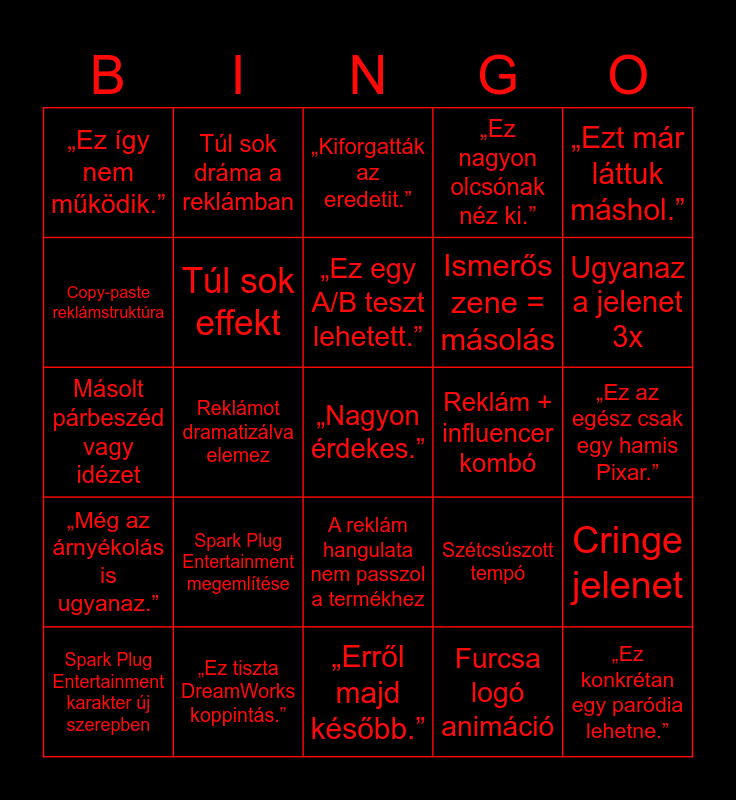 This bingo card has 50 words: „Ez másolat.”, „Nagyon érdekes.”, „Ez klisés.”, „Erről majd később.”, Spark Plug Entertainment megemlítése, Furcsa narrátorhang, Túl sok dráma a reklámban, Random zenebetét, Copy-paste reklámstruktúra, Üvöltő reklámhang, Túl sok effekt, „Ez nagyon olcsónak néz ki.”, Cringe jelenet, Szétcsúszott tempó, Ingyen hely, Ingyen hely, „Ez egy A/B teszt lehetett.”, Reklám + influencer kombó, Túl direkt üzenet, „Ezt már láttuk máshol.”, Reklámot dramatizálva elemez, Furcsa logó animáció, „Ez így nem működik.”, Ismerős zene = másolás, Reklám, ami jobban néz ki, mint a termék, „Ez konkrétan egy paródia lehetne.”, Ugyanaz a jelenet 3x, Jellegzetes nevetés elemzés közben, „Kiforgatták az eredetit.”, A reklám hangulata nem passzol a termékhez, Direkt amerikai stílusú reklám, „Ez fájt.”, Túl sok szöveg a reklámban, Gyenge CGI, „Ez tiszta DreamWorks koppintás.”, „Spark Plug-vibe, száz százalék.”, „Ugyanaz a jelenet, más köntösben.”, Karakterek egy az egyben lemásolva, Animációs stílus 1:1 átvéve, „Ez az egész csak egy hamis Pixar.”, Koppintott logó vagy cím, Gyanúsan hasonló zene, „Ez konkrétan plagizálás.”, Híres jelenet újrajátszva más szereplőkkel, Spark Plug Entertainment karakter új szerepben, Másolt párbeszéd vagy idézet, „Csak a modell más, minden más ugyanaz.”, Eredeti és másolat egymás mellé téve, „Még az árnyékolás is ugyanaz.” and „Ez már a paródia határát súrolja.”.