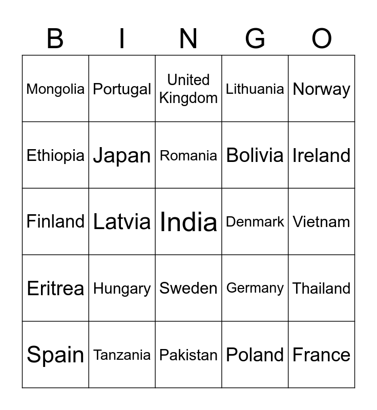This bingo card has 37 words: Brazil, Turkey, Italy, Japan, Thailand, Hungary, Romania, Iceland, Norway, Estonia, Latvia, Lithuania, India, Vietnam, Ethiopia, Eritrea, Iran, United Kingdom, Sweden, Denmark, Mongolia, Ireland, Spain, Pakistan, China, Poland, Portugal, Russia, Ukraine, Greece, Somalia, Tanzania, Finland, France, Germany, Bolivia and Azerbaijan.