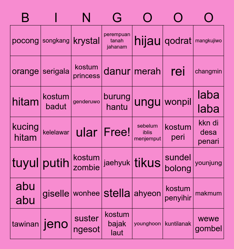 This bingo card has a free space and 48 words: ahyeon, rei, kostum bajak laut, kelelawar, genderuwo, kkn di desa penari, songkang, jeno, qodrat, jaehyuk, mangkujiwo, perempuan tanah jahanam, wonpil, ungu, abu abu, kostum peri, orange, changmin, kostum penyihir, hijau, merah, ular, pocong, serigala, makmum, kostum princess, laba laba, tawinan, burung hantu, kostum badut, kuntilanak, sebelum iblis menjemput, younjung, giselle, kucing hitam, tikus, sundel bolong, hitam, kostum zombie, wonhee, tuyul, wewe gombel, krystal, suster ngesot, danur, stella, putih and younghoon.