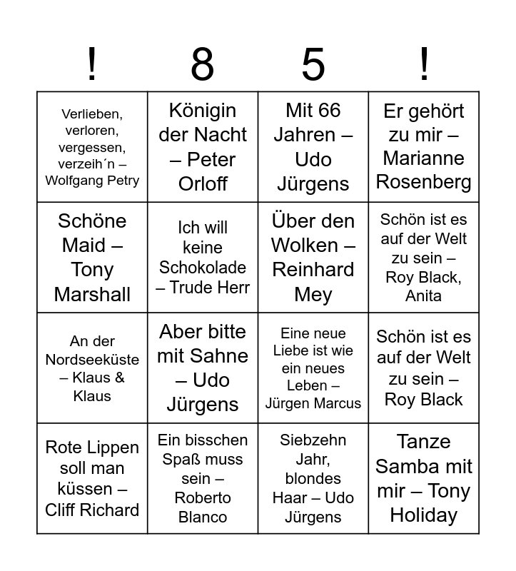 This bingo card has 40 words: Fiesta Mexicana – Rex Gildo, Eine neue Liebe ist wie ein neues Leben – Jürgen Marcus, Santa Maria – Roland Kaiser, Über den Wolken – Reinhard Mey, Atemlos durch die Nacht – Helene Fischer, Immer wieder sonntags – Cindy & Bert, Schön ist es auf der Welt zu sein – Roy Black, Anita, Die rote Sonne von Barbados – Die Flippers, Schöne Maid – Tony Marshall, Tanze Samba mit mir – Tony Holiday, Schön ist es auf der Welt zu sein – Roy Black, Er gehört zu mir – Marianne Rosenberg, Rote Lippen soll man küssen – Cliff Richard, Siebzehn Jahr, blondes Haar – Udo Jürgens, Ein bisschen Spaß muss sein – Roberto Blanco, Du hast mich tausendmal belogen – Andrea Berg, Ganz in Weiss – Roy Black, Verlieben, verloren, vergessen, verzeih´n – Wolfgang Petry, Verdammt ich lieb dich – Matthias Reim, Mit 66 Jahren – Udo Jürgens, Er gehört zu mir – Marianne Rosenberg, Ich liebe das Leben – Vicky Leandros, An der Nordseeküste – Klaus & Klaus, Ich will keine Schokolade – Trude Herr, Marmor, Stein und Eisen bricht – Drafi Deutscher, Für mich solls rote Rosen regnen – Hildegard Knef, Wunder gibt es immer wieder – Katja Ebstein, Ein Bett im Kornfeld – Jürgen Drews, Lotosblume – Die Flippers, Ich war noch niemals in New York – Udo Jürgens, Ohne Krimi geht die Mimi nie ins Bett – Bill Ramsey, Der Papa wird`s schon richten – Peter Alexander, Die kleine Kneipe – Peter Alexander, Griechischer Wein – Udo Jürgens, Aber bitte mit Sahne – Udo Jürgens, Pack die Badehose ein – Conny Froboess, Du hast den Farbfilm vergessen – Nina Hagen, Über sieben Brücken musst du gehen – Karat, Königin der Nacht – Peter Orloff and Wann wird’s mal wieder richtig Sommer – Rudi Carell.
