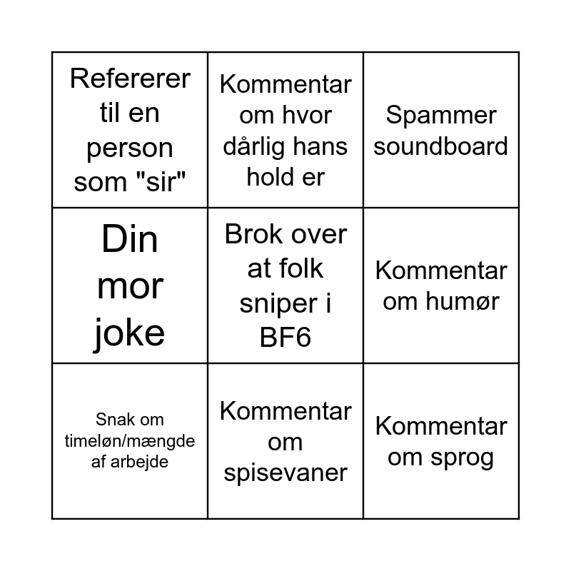 This bingo card has a free space and 8 words: Kommentar om humør, Spammer soundboard, Kommentar om hvor dårlig hans hold er, Snak om timeløn/mængde af arbejde, Refererer til en person som "sir", Kommentar om sprog, Din mor joke and Kommentar om spisevaner.