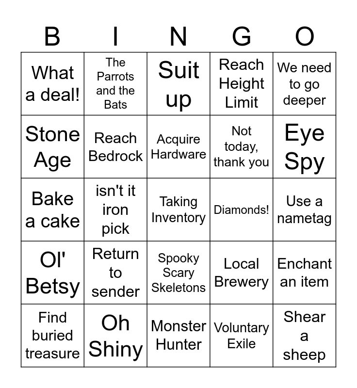 This bingo card has a free space and 24 words: Return to sender, Oh Shiny, Acquire Hardware, Find buried treasure, We need to go deeper, What a deal!, Stone Age, The Parrots and the Bats, Diamonds!, Spooky Scary Skeletons, Not today, thank you, Bake a cake, Local Brewery, Enchant an item, Reach Bedrock, Voluntary Exile, Use a nametag, Suit up, Eye Spy, isn't it iron pick, Shear a sheep, Ol' Betsy, Reach Height Limit and Monster Hunter.