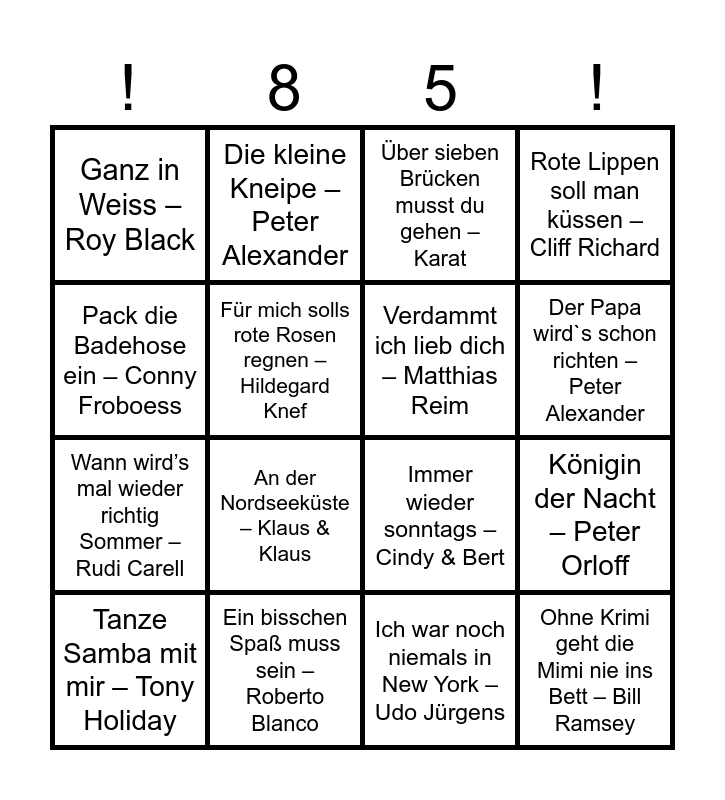 This bingo card has 40 words: Schön ist es auf der Welt zu sein – Roy Black, Anita, Immer wieder sonntags – Cindy & Bert, Die rote Sonne von Barbados – Die Flippers, Verdammt ich lieb dich – Matthias Reim, Mit 66 Jahren – Udo Jürgens, Marmor, Stein und Eisen bricht – Drafi Deutscher, Der Papa wird`s schon richten – Peter Alexander, Griechischer Wein – Udo Jürgens, Pack die Badehose ein – Conny Froboess, Ohne Krimi geht die Mimi nie ins Bett – Bill Ramsey, Königin der Nacht – Peter Orloff, Rote Lippen soll man küssen – Cliff Richard, Tanze Samba mit mir – Tony Holiday, Ich war noch niemals in New York – Udo Jürgens, Ein bisschen Spaß muss sein – Roberto Blanco, Du hast mich tausendmal belogen – Andrea Berg, Fiesta Mexicana – Rex Gildo, Ganz in Weiss – Roy Black, Du hast den Farbfilm vergessen – Nina Hagen, Über sieben Brücken musst du gehen – Karat, Atemlos durch die Nacht – Helene Fischer, Er gehört zu mir – Marianne Rosenberg, Wann wird’s mal wieder richtig Sommer – Rudi Carell, Für mich solls rote Rosen regnen – Hildegard Knef, Wunder gibt es immer wieder – Katja Ebstein, Schöne Maid – Tony Marshall, Ein Bett im Kornfeld – Jürgen Drews, Lotosblume – Die Flippers, Santa Maria – Roland Kaiser, Schön ist es auf der Welt zu sein – Roy Black, Eine neue Liebe ist wie ein neues Leben – Jürgen Marcus, Siebzehn Jahr, blondes Haar – Udo Jürgens, Er gehört zu mir – Marianne Rosenberg, Ich liebe das Leben – Vicky Leandros, An der Nordseeküste – Klaus & Klaus, Ich will keine Schokolade – Trude Herr, Über den Wolken – Reinhard Mey, Aber bitte mit Sahne – Udo Jürgens, Die kleine Kneipe – Peter Alexander and Verlieben, verloren, vergessen, verzeih´n – Wolfgang Petry.