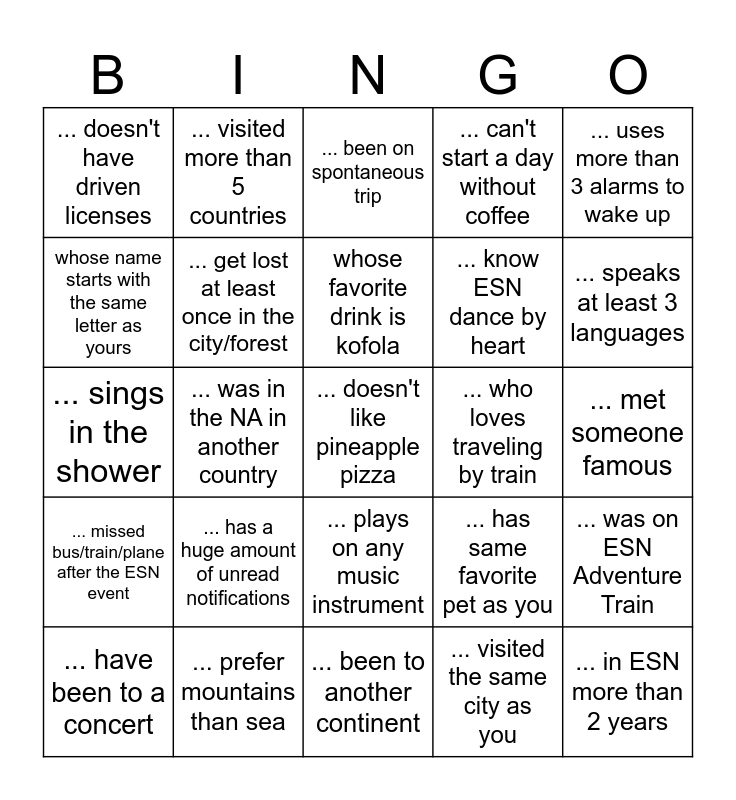 This bingo card has 25 words: ... has a huge amount of unread notifications, ... been to another continent, whose favorite drink is kofola, ... have been to a concert, ... uses more than 3 alarms to wake up, ... doesn't have driven licenses, whose name starts with the same letter as yours, ... visited more than 5 countries, ... who loves traveling by train, ... plays on any music instrument, ... know ESN dance by heart, ... sings in the shower, ... has same favorite pet as you, ... was on ESN Adventure Train, ... get lost at least once in the city/forest, ... in ESN more than 2 years, ... met someone famous, ... been on spontaneous trip, ... speaks at least 3 languages, ... was in the NA in another country, ... doesn't like pineapple pizza, ... prefer mountains than sea, ... missed bus/train/plane after the ESN event, ... can't start a day without coffee and ... visited the same city as you.