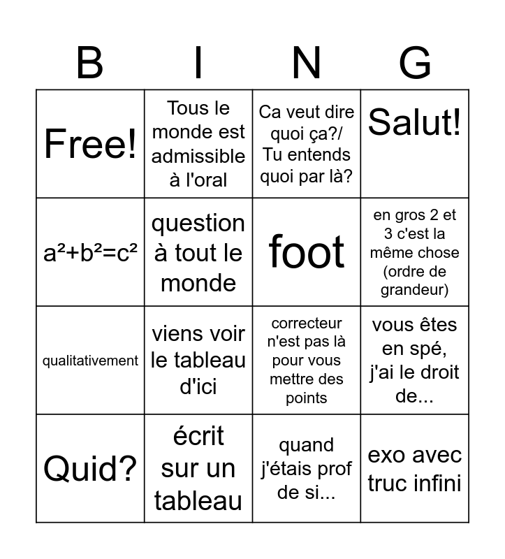 This bingo card has 16 words: Quid?, écrit sur un tableau, Ca veut dire quoi ça?/ Tu entends quoi par là?, Salut!, a²+b²=c², Tous le monde est admissible à l'oral, correcteur n'est pas là pour vous mettre des points, vous êtes en spé, j'ai le droit de..., Free!, question à tout le monde, quand j'étais prof de si..., en gros 2 et 3 c'est la même chose (ordre de grandeur), qualitativement, viens voir le tableau d'ici, foot and exo avec truc infini.