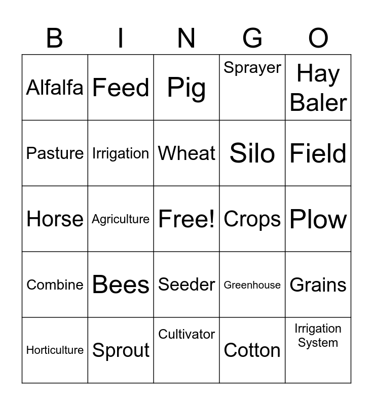 This bingo card has a free space and 34 words: Soil, Cotton, Goat, Fence, Combine, Irrigation, Hay Baler, Horticulture, Feed, Barn, Wheat, Pig, Vet, Harvest, Crops, Field, Sprout, Horse, Bees, Greenhouse, Seeder, Forestry, Alfalfa, Plow, Cultivator, Irrigation System, Sprayer, Drone, Silo, Pasture, Acre, Agriculture, Grains and Feed.