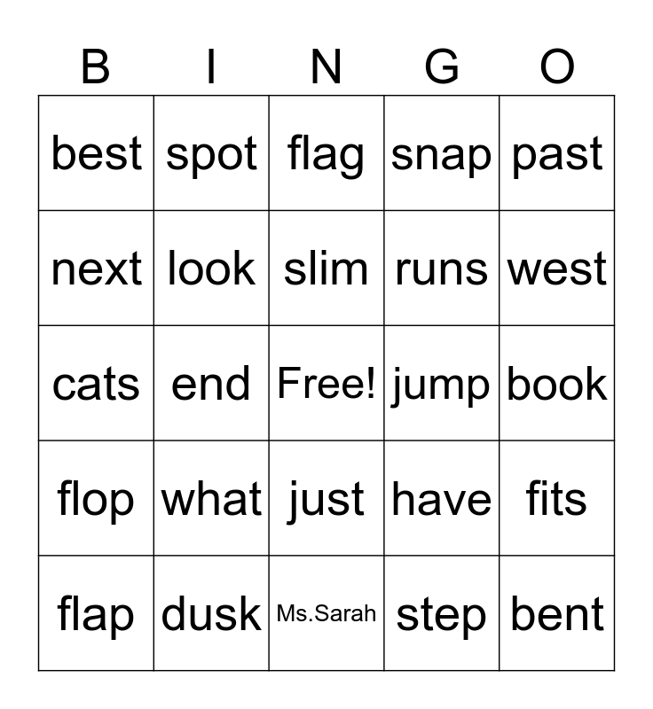 This bingo card has a free space and 24 words: what, dusk, slim, flap, past, best, next, spot, jump, just, runs, cats, have, fits, look, step, book, flag, west, end, bent, flop, snap and Ms.Sarah.