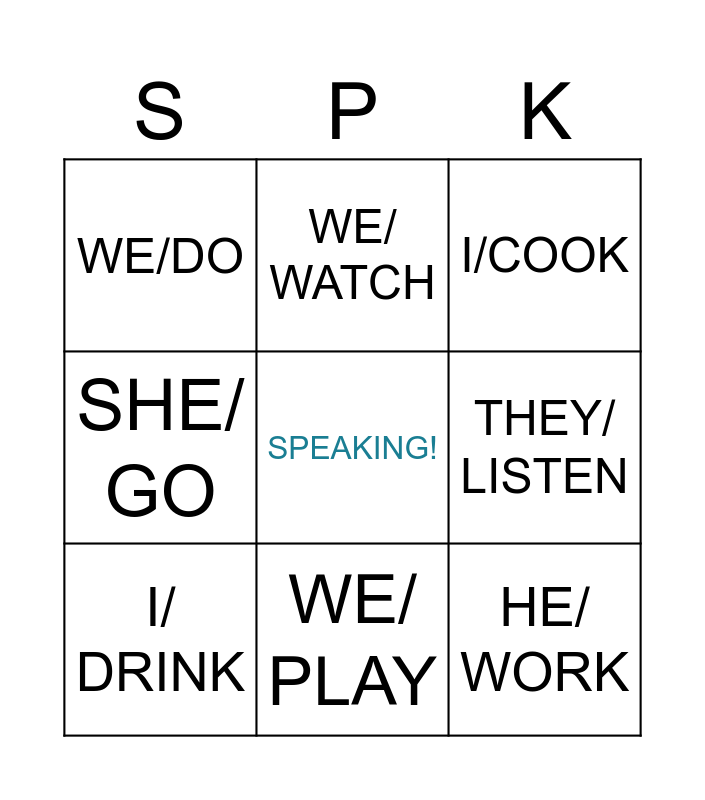 This bingo card has a free space and 17 words: SHE/ PLAY, HE/ READ, I/COOK, WE/DO, THEY/ LIKE, SHE/ GO, HE/ HAVE, I/ DRINK, WE/ PLAY, THEY/ LISTEN, I/ SPEAK, SHE/ STUDY, HE/ WORK, WE/ WATCH, THEY/ LIVE, I/ DRIVE and HE/ WEAR.