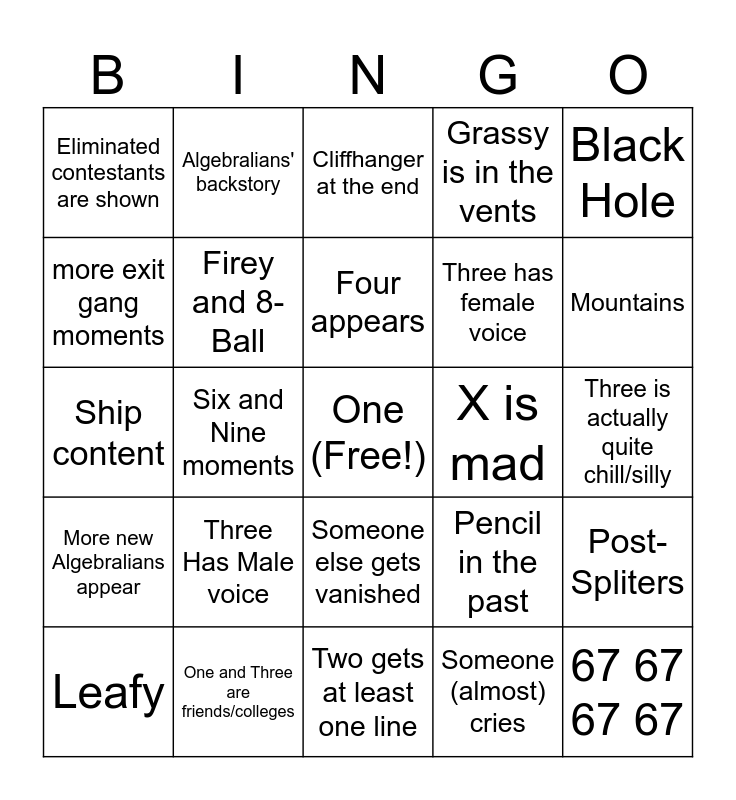 This bingo card has a free space and 24 words: Three Has Male voice, One and Three are friends/colleges, Four appears, Leafy, Black Hole, Eliminated contestants are shown, more exit gang moments, Algebralians' backstory, X is mad, Someone else gets vanished, Three has female voice, Ship content, Pencil in the past, Post-Spliters, Firey and 8-Ball, Someone (almost) cries, Three is actually quite chill/silly, Cliffhanger at the end, Mountains, Six and Nine moments, 67 67 67 67, More new Algebralians appear, Grassy is in the vents and Two gets at least one line.