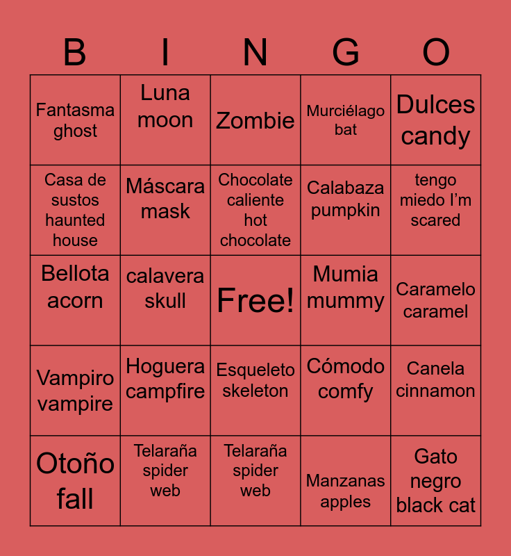 This bingo card has a free space and 24 words: Otoño fall, Hoguera campfire, Chocolate caliente hot chocolate, Manzanas apples, Dulces candy, Fantasma ghost, Luna moon, Zombie, Mumia mummy, Caramelo caramel, Bellota acorn, Máscara mask, Cómodo comfy, Canela cinnamon, Casa de sustos haunted house, Telaraña spider web, Telaraña spider web, Murciélago bat, tengo miedo I’m scared, Vampiro vampire, calavera skull, Esqueleto skeleton, Calabaza pumpkin and Gato negro black cat.