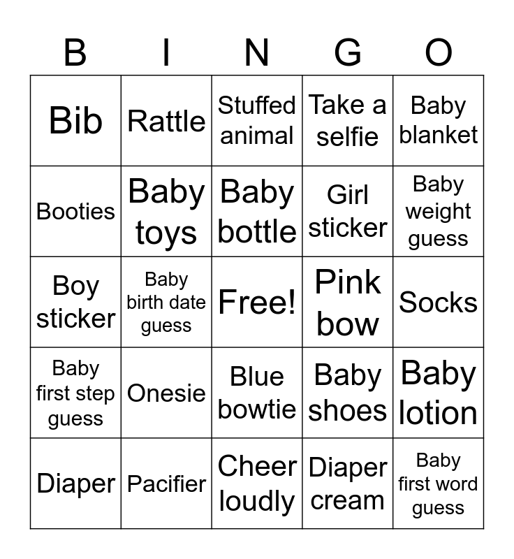 This bingo card has a free space and 24 words: Onesie, Pacifier, Baby bottle, Diaper, Baby blanket, Bib, Booties, Rattle, Pink bow, Blue bowtie, Girl sticker, Boy sticker, Baby shoes, Baby lotion, Baby toys, Diaper cream, Socks, Stuffed animal, Baby weight guess, Baby birth date guess, Baby first word guess, Baby first step guess, Take a selfie and Cheer loudly.