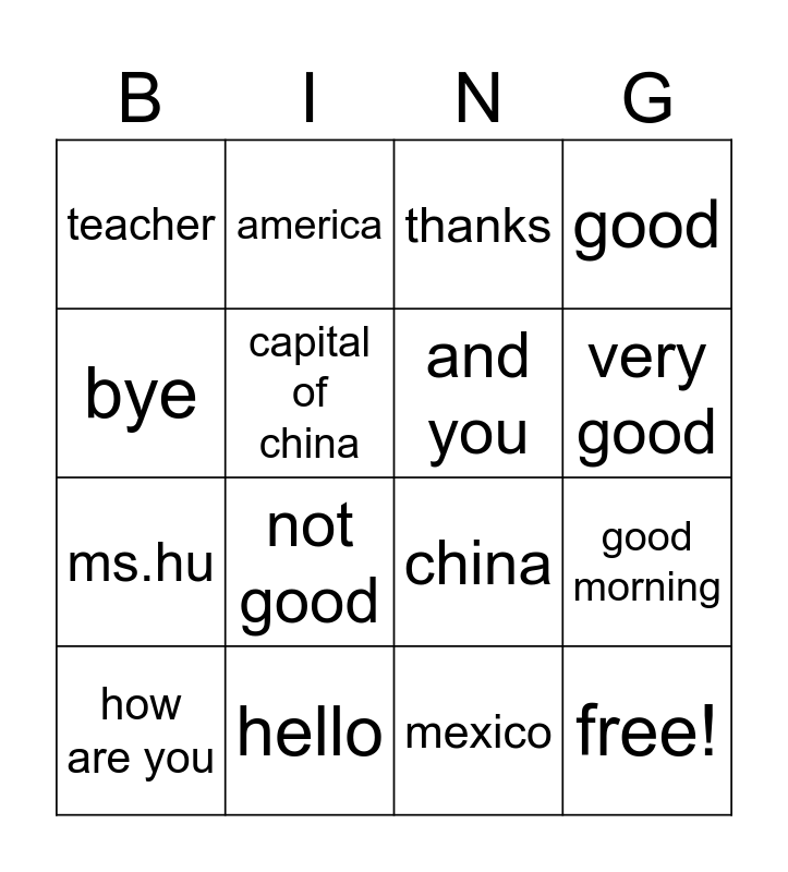 This bingo card has 16 words: hello, good morning, thanks, teacher, ms.hu, america, china, mexico, bye, capital of china, how are you, good, not good, very good, and you and free!.