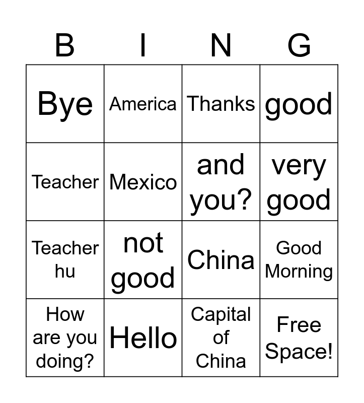 This bingo card has 16 words: Hello, Good Morning, Thanks, Bye, Teacher hu, America, China, Capital of China, Teacher, Mexico, How are you doing?, good, not good, very good, and you? and Free Space!.