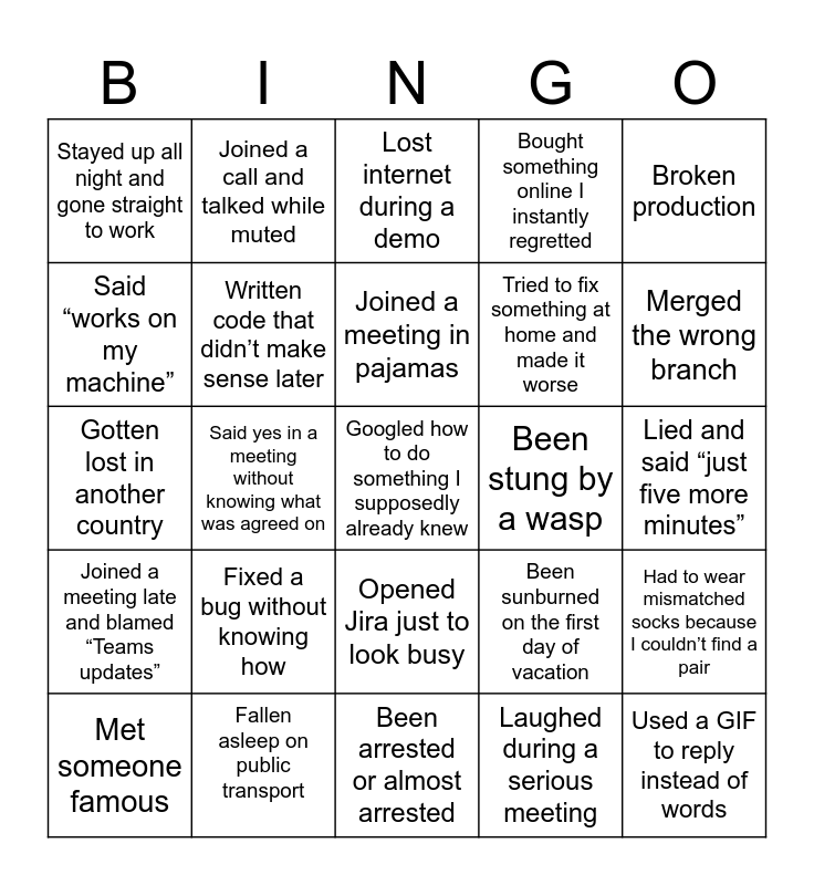This bingo card has 25 words: Fixed a bug without knowing how, Been arrested or almost arrested, Joined a meeting in pajamas, Met someone famous, Broken production, Stayed up all night and gone straight to work, Said “works on my machine”, Joined a call and talked while muted, Been stung by a wasp, Opened Jira just to look busy, Tried to fix something at home and made it worse, Gotten lost in another country, Been sunburned on the first day of vacation, Had to wear mismatched socks because I couldn’t find a pair, Written code that didn’t make sense later, Used a GIF to reply instead of words, Lied and said “just five more minutes”, Lost internet during a demo, Merged the wrong branch, Said yes in a meeting without knowing what was agreed on, Googled how to do something I supposedly already knew, Fallen asleep on public transport, Joined a meeting late and blamed “Teams updates”, Bought something online I instantly regretted and Laughed during a serious meeting.
