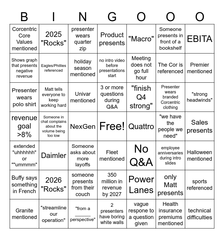 This bingo card has a free space and 48 words: Power Lanes, The Cor is referenced, 2 presenters have boring white walls, Someone in chat complains about the volume being too low, Univar mentioned, Sales presents, 2025 "Rocks", "streamline our operation", Someone presents in front of a bookshelf, Fleet mentioned, EBITA, Product presents, Presenter wears branded Corcentric clothing, "finish Q4 strong", Buffy says something in French, "we have the people we need", Shows graph that presents negative revenue, Premier mentioned, only Matt presents, "Macro", Meeting does not go full hour, NexGen, Corcentric Core Values mentioned, Eagles/Phillies referenced, sports referenced, holiday season mentioned, "strong headwinds", Granite mentioned, 3 or more questions during Q&A, Matt tells everyone to keep working hard, Health insurance premiums mentioned, Quattro, Halloween mentioned, 2026 "Rocks", revenue goal >8%, No Q&A, employee anniversaries during intro slides, Presenter wears polo shirt, Someone asks about more layoffs, someone presents from their couch, extended "uhhhhhh" or ""ummmm", technical difficulties, presenter wears quarter zip, "from a ______ perspective", no intro video before presentations start, 350 million in revenue by 2027, Daimler and vague respone to a question given.