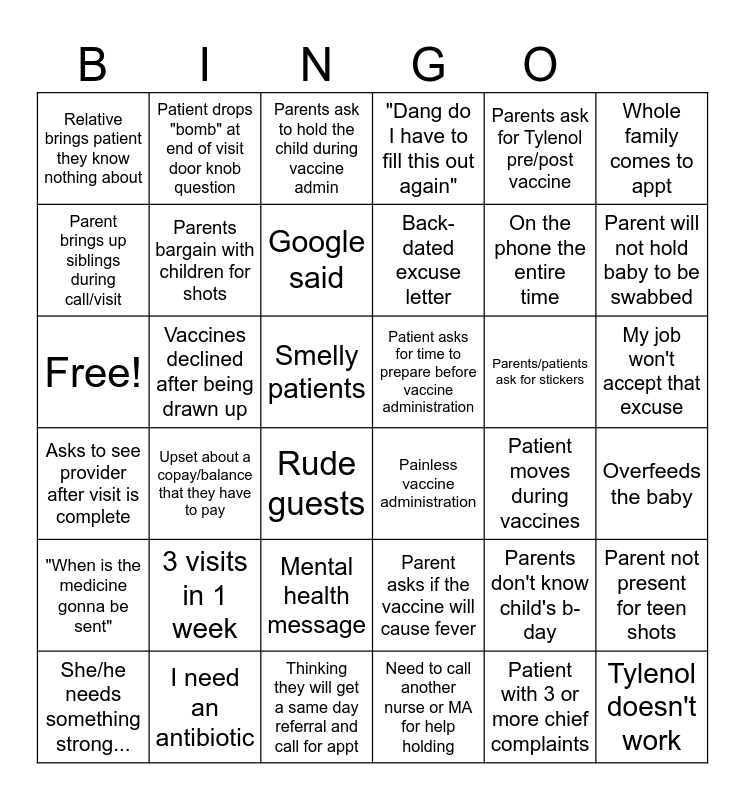 This bingo card has 36 words: Parent asks if the vaccine will cause fever, Mental health message, Need to call another nurse or MA for help holding, Parent brings up siblings during call/visit, Asks to see provider after visit is complete, Patient asks for time to prepare before vaccine administration, Parents bargain with children for shots, Thinking they will get a same day referral and call for appt, Parents ask for Tylenol pre/post vaccine, Parents don't know child's b-day, Parent will not hold baby to be swabbed, "Dang do I have to fill this out again", Parent not present for teen shots, Vaccines declined after being drawn up, Back-dated excuse letter, Relative brings patient they know nothing about, "When is the medicine gonna be sent", Parents/patients ask for stickers, Free!, Parents ask to hold the child during vaccine admin, Smelly patients, Upset about a copay/balance that they have to pay, Painless vaccine administration, Rude guests, Patient moves during vaccines, Patient drops "bomb" at end of visit door knob question, On the phone the entire time, I need an antibiotic, Google said, Whole family comes to appt, Tylenol doesn't work, She/he needs something strong..., Overfeeds the baby, My job won't accept that excuse, 3 visits in 1 week and Patient with 3 or more chief complaints.
