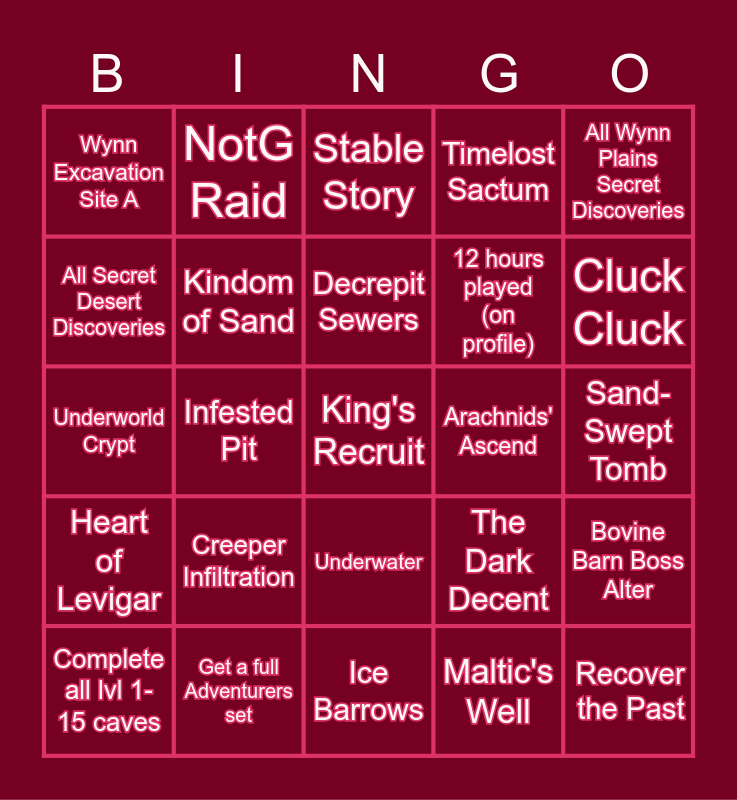 This bingo card has a free space and 24 words: Complete all lvl 1-15 caves, Creeper Infiltration, Decrepit Sewers, Maltic's Well, All Wynn Plains Secret Discoveries, Wynn Excavation Site A, NotG Raid, Stable Story, Arachnids' Ascend, Sand-Swept Tomb, Underworld Crypt, Kindom of Sand, The Dark Decent, Bovine Barn Boss Alter, All Secret Desert Discoveries, Get a full Adventurers set, Ice Barrows, Timelost Sactum, Cluck Cluck, Heart of Levigar, Infested Pit, Underwater, 12 hours played (on profile) and Recover the Past.