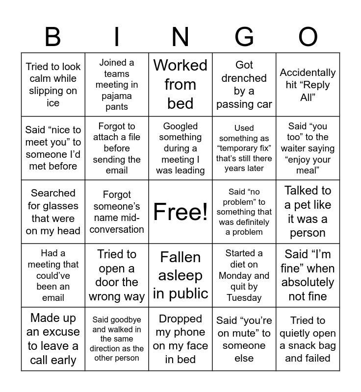This bingo card has a free space and 34 words: Been on mute while talking, Said “you’re on mute” to someone else, Forgot what I was saying mid-sentence, Pretended to look busy when someone walked by, Had a meeting that could’ve been an email, Forgot to attach a file before sending the email, Accidentally hit “Reply All”, Made up an excuse to leave a call early, Joined a teams meeting in pajama pants, Used a virtual background to hide a messy room, Googled something during a meeting I was leading, Worked from bed, Told myself “I’ll just check one thing” and lost an hour, Forgot someone’s name right after they introduced themselves, Said “no problem” to something that was definitely a problem, Said “you too” to the waiter saying “enjoy your meal”, Said goodbye and walked in the same direction as the other person, Searched for glasses that were on my head, Tried to open a door the wrong way, Started a diet on Monday and quit by Tuesday, Fallen asleep in public, Had to pretend to like someone’s cooking, Tried to look calm while slipping on ice, Talked to a pet like it was a person, Dropped my phone on my face in bed, Tried to quietly open a snack bag and failed, Got drenched by a passing car, Clapped when the plane landed, Used something as “temporary fix” that’s still there years later, Said “nice to meet you” to someone I’d met before, Tried to sneak a fart and failed, Forgot someone’s name mid-conversation, Said “I’m fine” when absolutely not fine and Told myself I’d go for a run and never did.