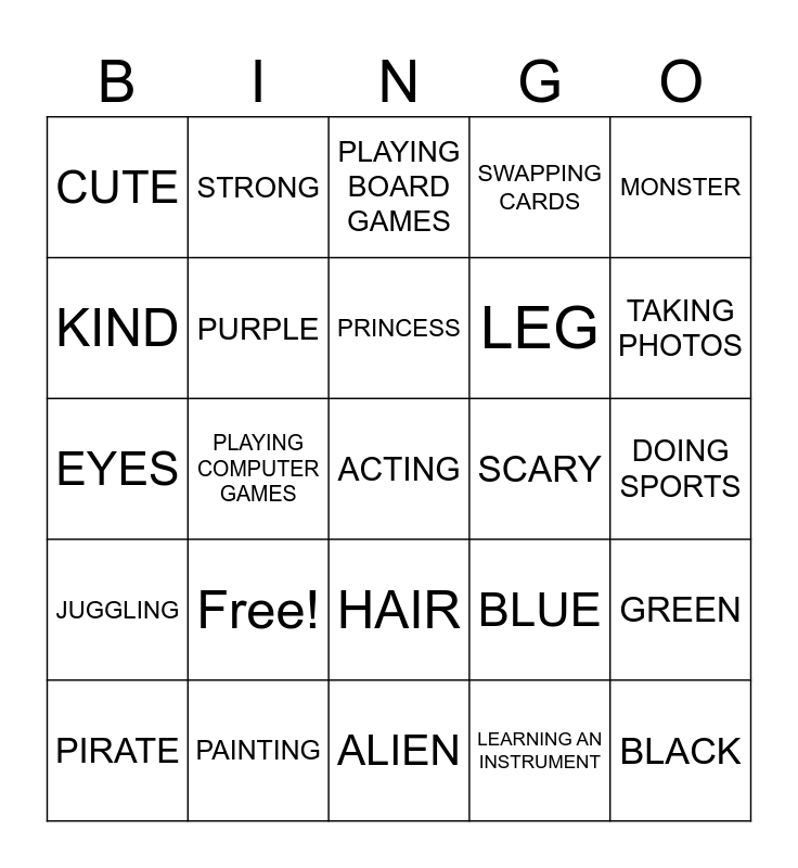 This bingo card has 25 words: Free!, ALIEN, PRINCESS, PIRATE, MONSTER, CUTE, KIND, STRONG, SCARY, HAIR, LEG, EYES, BLUE, GREEN, PURPLE, BLACK, DOING SPORTS, PLAYING BOARD GAMES, TAKING PHOTOS, PLAYING COMPUTER GAMES, ACTING, PAINTING, JUGGLING, SWAPPING CARDS and LEARNING AN INSTRUMENT.