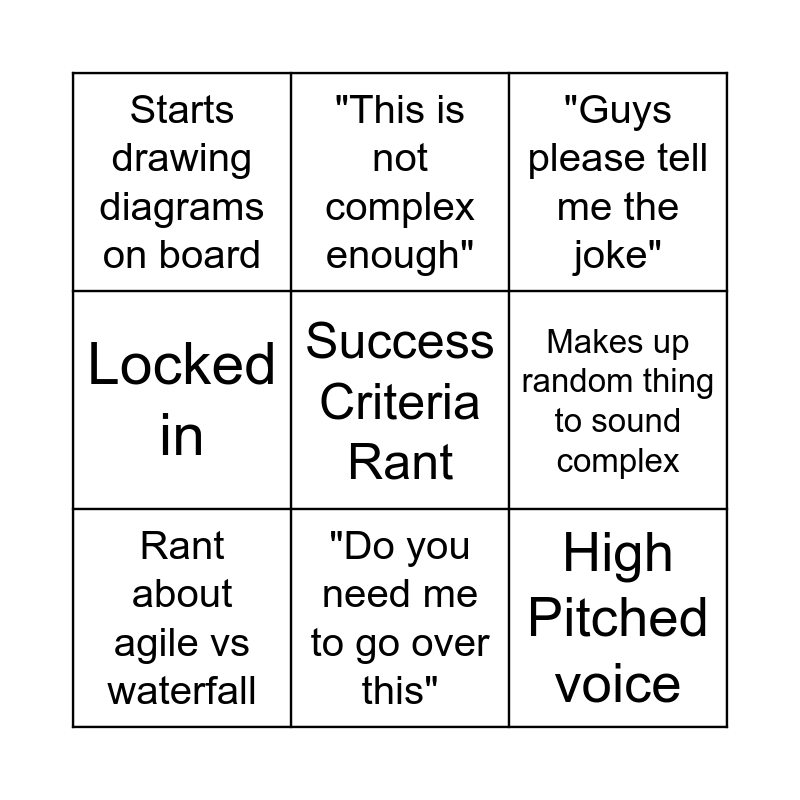 This bingo card has 20 words: Talks about his 20 years in industry, "Its not measureable", "Guys please tell me the joke", Asks if JD/William are mentally capable, Mentions Stephen Hawking, Success Criteria Rant, Says Wyatt knows what he's doing, Starts drawing diagrams on board, High Pitched voice, "This is not complex enough", "This scares me", Asks Nishaan if he is okay, Makes up random thing to sound complex, Pulls up email conversation with OCR, Rant about agile vs waterfall, Asks you to come and talk about your project, "Do you need me to go over this", Locked in, Chats for longer than half the lesson and Digging a hole analogy.