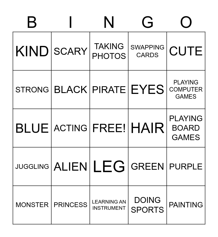 This bingo card has a free space and 24 words: ALIEN, PRINCESS, PIRATE, MONSTER, CUTE, KIND, STRONG, SCARY, HAIR, LEG, EYES, BLUE, GREEN, PURPLE, BLACK, DOING SPORTS, PLAYING BOARD GAMES, TAKING PHOTOS, PLAYING COMPUTER GAMES, ACTING, PAINTING, JUGGLING, SWAPPING CARDS and LEARNING AN INSTRUMENT.