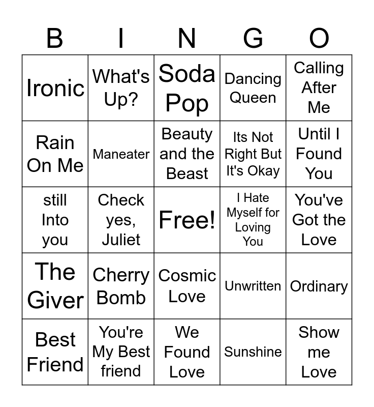 This bingo card has a free space and 39 words: You make my dreams (come true), Kiss Me, Ocean Avenue, Maneater, Best Friend, Cosmic Love, Beauty and the Beast, My Girl, Calling After Me, The Giver, Check yes, Juliet, Dancing Queen, Show me Love, You've Got the Love, I Hate Myself for Loving You, Cherry Bomb, Hand in My Pocket, Ironic, Untouched, Unwritten, Rain On Me, We Found Love, Its Not Right But It's Okay, Until I Found You, Feeling for you, Belong Together, Good Luck, Babe!, Femininomenon, Just the way you are, What's Up?, Golden, Speed Drive, Soda Pop, You're My Best friend, Sunshine, Just a Girl, Ordinary, still Into you and Beautiful Things.