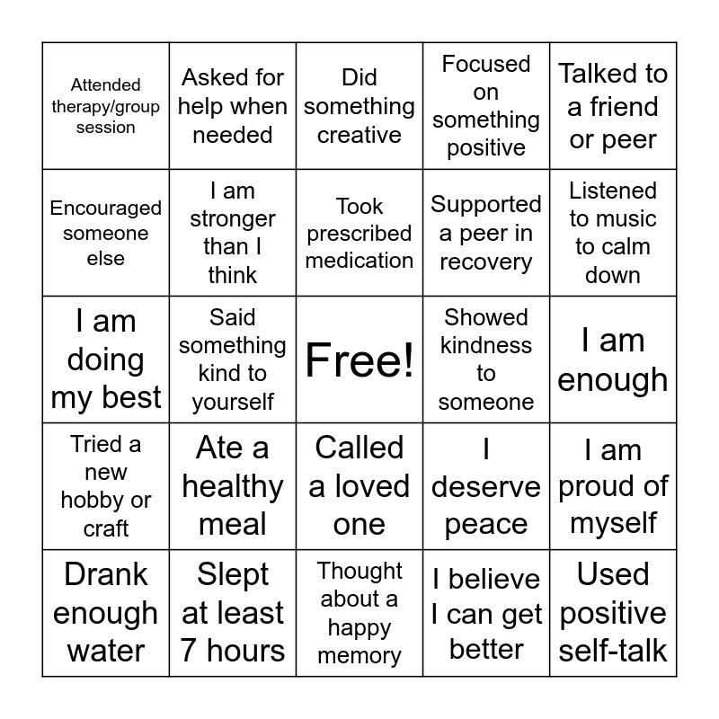 This bingo card has a free space and 24 words: Ate a healthy meal, Slept at least 7 hours, Took prescribed medication, Drank enough water, Talked to a friend or peer, Attended therapy/group session, Encouraged someone else, Asked for help when needed, Showed kindness to someone, Called a loved one, Supported a peer in recovery, I am doing my best, I deserve peace, I am proud of myself, I am stronger than I think, I believe I can get better, I am enough, Did something creative, Listened to music to calm down, Said something kind to yourself, Used positive self-talk, Tried a new hobby or craft, Focused on something positive and Thought about a happy memory.