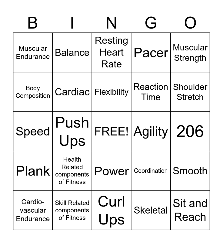 This bingo card has a free space and 24 words: Health Related components of Fitness, Skill Related components of Fitness, Flexibility, Cardio-vascular Endurance, Muscular Strength, Muscular Endurance, Body Composition, Balance, Agility, Power, Reaction Time, Speed, Coordination, Smooth, Cardiac, Skeletal, 206, Resting Heart Rate, Shoulder Stretch, Push Ups, Sit and Reach, Plank, Pacer and Curl Ups.