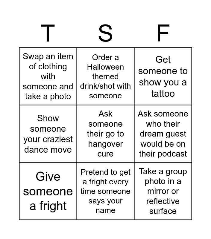 This bingo card has 30 words: Kiss someone, Take a spooky scene photo with 4+ people from the group, Take a photo with something Halloween themed, Find someone who has the same favourite Halloween film as you, Swap an item of clothing with someone and take a photo, Get someone to show you a tattoo, Give someone a fright, Chug a PINT glass full of water, Post a photo on your story and tag TSF, Take a shot or buy someone a drink, Compliment a stranger, Make a secret handshake with someone, Give someone a pen (or lipstick 😘) tattoo, Order a drink with the voice of Nosferatu, Tell an embarrassing story, Tell someone you just met a secret, Find someone who can play an instrument, Introduce yourself to each member of the group, Take a photo with your favourite costume in the group, Ask someone their go to hangover cure, Ask someone what is the gayest thing they’ve ever done, Find someone with a wig and take a picture with them, Order a Halloween themed drink/shot with someone, Take a group photo in a mirror or reflective surface, Ask someone who their dream guest would be on their podcast, Show someone your craziest dance move, Ask someone who they think the hottest person in the group is, Take a photo in each bar with someone new, Pretend to get a fright every time someone says your name and Get someone to show you photos of their pet.