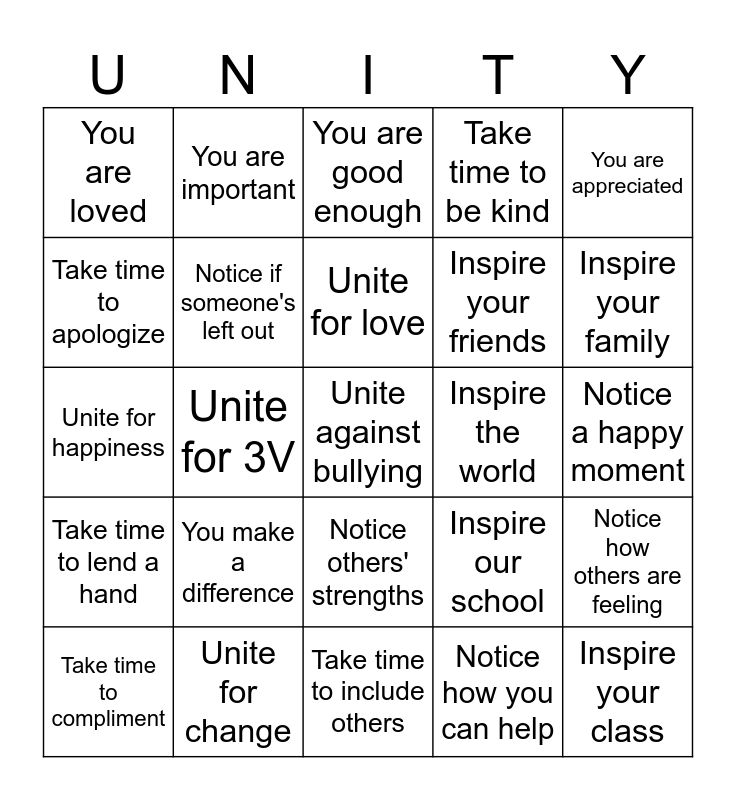 This bingo card has a free space and 24 words: You make a difference, Unite for change, Unite for love, Take time to compliment, You are appreciated, You are loved, Take time to apologize, You are important, Inspire the world, Notice others' strengths, Inspire your friends, Unite for happiness, Inspire our school, Notice how others are feeling, Notice if someone's left out, Notice how you can help, Notice a happy moment, You are good enough, Inspire your family, Unite for 3V, Inspire your class, Take time to lend a hand, Take time to be kind and Take time to include others.