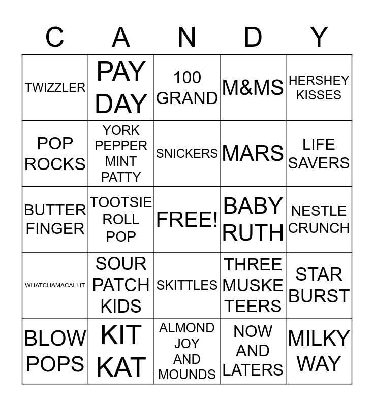 This bingo card has a free space and 24 words: SOUR PATCH KIDS, KIT KAT, SNICKERS, BLOW POPS, HERSHEY KISSES, TWIZZLER, POP ROCKS, PAY DAY, BABY RUTH, SKITTLES, MARS, BUTTER FINGER, THREE MUSKE TEERS, STAR BURST, YORK PEPPER MINT PATTY, NOW AND LATERS, NESTLE CRUNCH, 100 GRAND, LIFE SAVERS, TOOTSIE ROLL POP, MILKY WAY, WHATCHAMACALLIT, M&MS and ALMOND JOY AND MOUNDS.