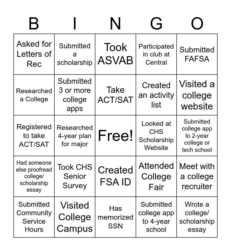This bingo card has a free space and 24 words: Took CHS Senior Survey, Visited College Campus, Take ACT/SAT, Submitted Community Service Hours, Submitted FAFSA, Asked for Letters of Rec, Researched a College, Submitted a scholarship, Looked at CHS Scholarship Website, Created FSA ID, Created an activity list, Registered to take ACT/SAT, Attended College Fair, Meet with a college recruiter, Submitted 3 or more college apps, Submitted college app to 4-year school, Submitted college app to 2-year college or tech school, Took ASVAB, Visited a college website, Researched 4-year plan for major, Wrote a college/ scholarship essay, Had someone else proofread college/ scholarship essay, Participated in club at Central and Has memorized SSN.