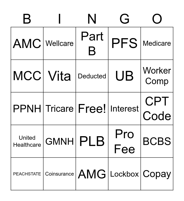 This bingo card has a free space and 24 words: GMNH, Coinsurance, Deducted, PEACHSTATE, Medicare, AMC, MCC, Wellcare, Interest, PLB, UB, PPNH, Pro Fee, BCBS, Vita, Lockbox, CPT Code, Part B, Worker Comp, Tricare, Copay, United Healthcare, PFS and AMG.
