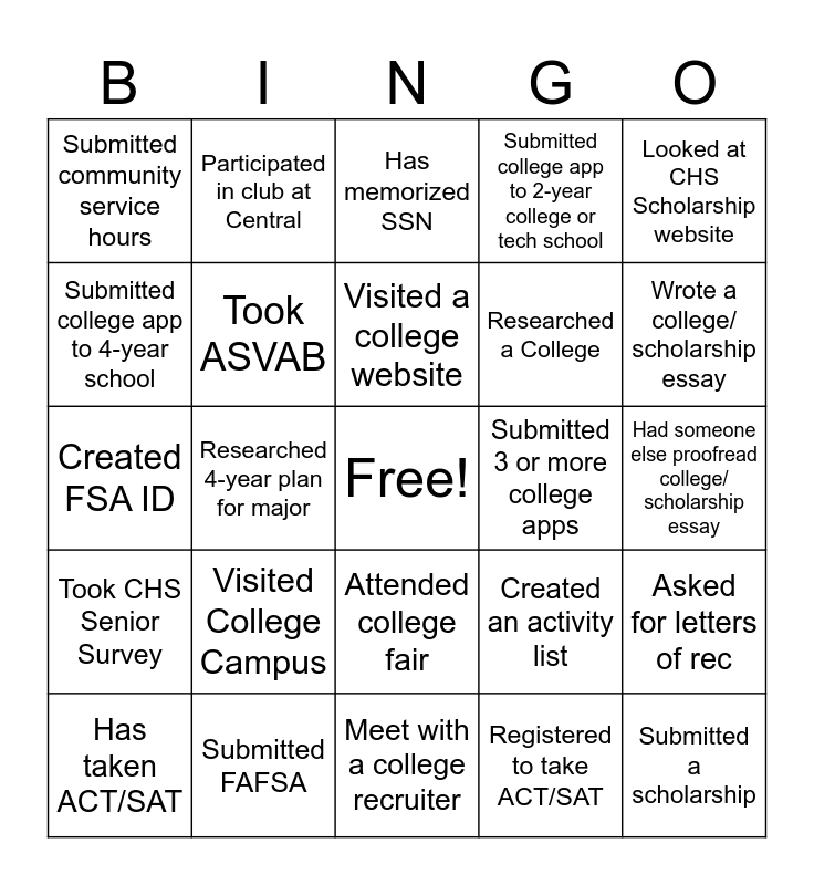 This bingo card has a free space and 24 words: Visited College Campus, Submitted FAFSA, Visited a college website, Has taken ACT/SAT, Looked at CHS Scholarship website, Submitted community service hours, Submitted college app to 4-year school, Participated in club at Central, Submitted 3 or more college apps, Attended college fair, Researched a College, Created FSA ID, Created an activity list, Asked for letters of rec, Took ASVAB, Registered to take ACT/SAT, Had someone else proofread college/ scholarship essay, Has memorized SSN, Wrote a college/ scholarship essay, Researched 4-year plan for major, Submitted a scholarship, Took CHS Senior Survey, Submitted college app to 2-year college or tech school and Meet with a college recruiter.