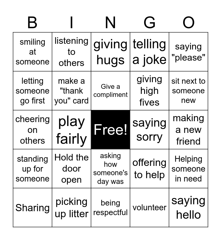 This bingo card has a free space and 24 words: Hold the door open, picking up litter, Give a compliment, Sharing, saying "please", smiling at someone, letting someone go first, listening to others, saying sorry, asking how someone's day was, giving high fives, cheering on others, offering to help, Helping someone in need, make a "thank you" card, volunteer, making a new friend, giving hugs, sit next to someone new, play fairly, saying hello, standing up for someone, telling a joke and being respectful.