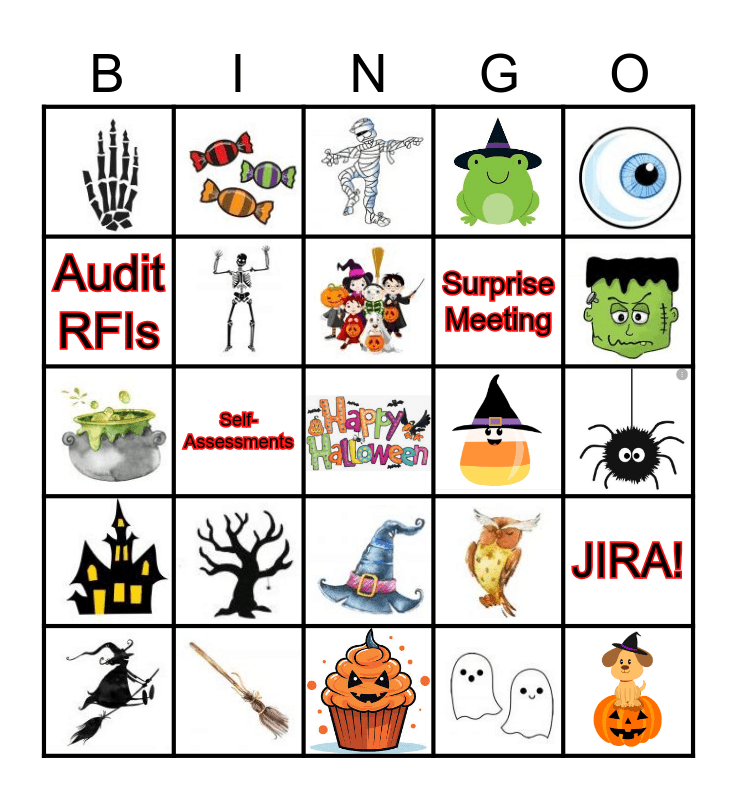 This bingo card has 27 images, a free space and 7 words: Join My Zoom, Surprise Meeting, Audit RFIs, Fire Drill!!, Self-Assessments, JIRA! and You're on Mute.