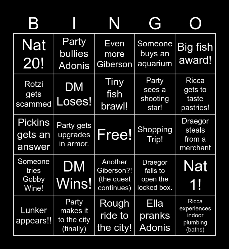 This bingo card has a free space and 24 words: DM Wins!, Party makes it to the city (finally), Tiny fish brawl!, Lunker appears!!, Big fish award!, Nat 20!, Rotzi gets scammed, Party bullies Adonis, Shopping Trip!, Another Giberson?! (the quest continues), Party sees a shooting star!, Pickins gets an answer, Draegor fails to open the locked box., Nat 1!, DM Loses!, Ella pranks Adonis, Draegor steals from a merchant, Even more Giberson, Ricca gets to taste pastries!, Party gets upgrades in armor., Ricca experiences indoor plumbing (baths), Someone tries Gobby Wine!, Someone buys an aquarium and Rough ride to the city!.
