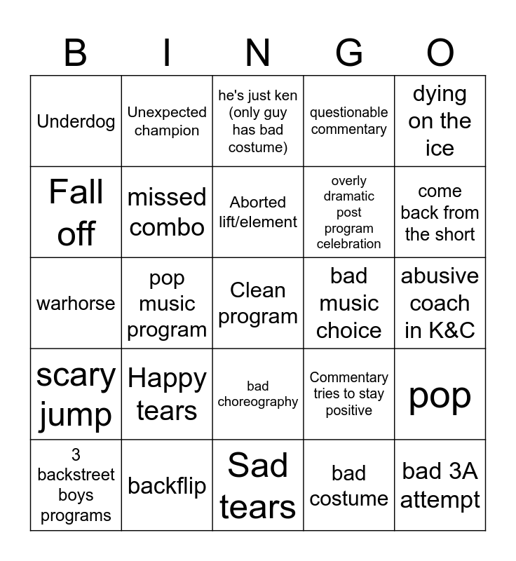 This bingo card has 25 words: Happy tears, Sad tears, Aborted lift/element, 3 backstreet boys programs, dying on the ice, Underdog, Fall off, Unexpected champion, bad music choice, bad choreography, overly dramatic post program celebration, warhorse, Commentary tries to stay positive, pop, missed combo, bad 3A attempt, abusive coach in K&C, he's just ken (only guy has bad costume), come back from the short, pop music program, Clean program, backflip, scary jump, questionable commentary and bad costume.
