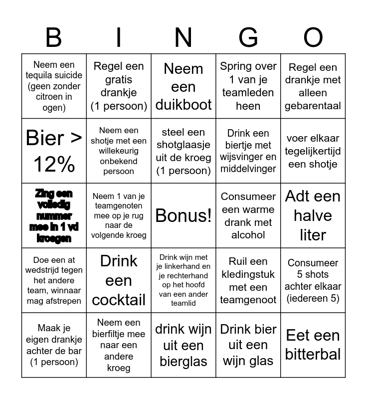 This bingo card has a free space and 24 words: Drink een cocktail, Neem een bierfiltje mee naar een andere kroeg, steel een shotglaasje uit de kroeg (1 persoon), Maak je eigen drankje achter de bar (1 persoon), Regel een drankje met alleen gebarentaal, Neem een tequila suicide (geen zonder citroen in ogen), Bier > 12%, Regel een gratis drankje (1 persoon), Consumeer een warme drank met alcohol, Drink wijn met je linkerhand en je rechterhand op het hoofd van een ander teamlid, Drink een biertje met wijsvinger en middelvinger, Zing een volledig nummer mee in 1 vd kroegen, Ruil een kledingstuk met een teamgenoot, Consumeer 5 shots achter elkaar (iedereen 5), Neem een shotje met een willekeurig onbekend persoon, Drink bier uit een wijn glas, Adt een halve liter, Neem een duikboot, voer elkaar tegelijkertijd een shotje, Neem 1 van je teamgenoten mee op je rug naar de volgende kroeg, Eet een bitterbal, Doe een at wedstrijd tegen het andere team, winnaar mag afstrepen, Spring over 1 van je teamleden heen and drink wijn uit een bierglas.