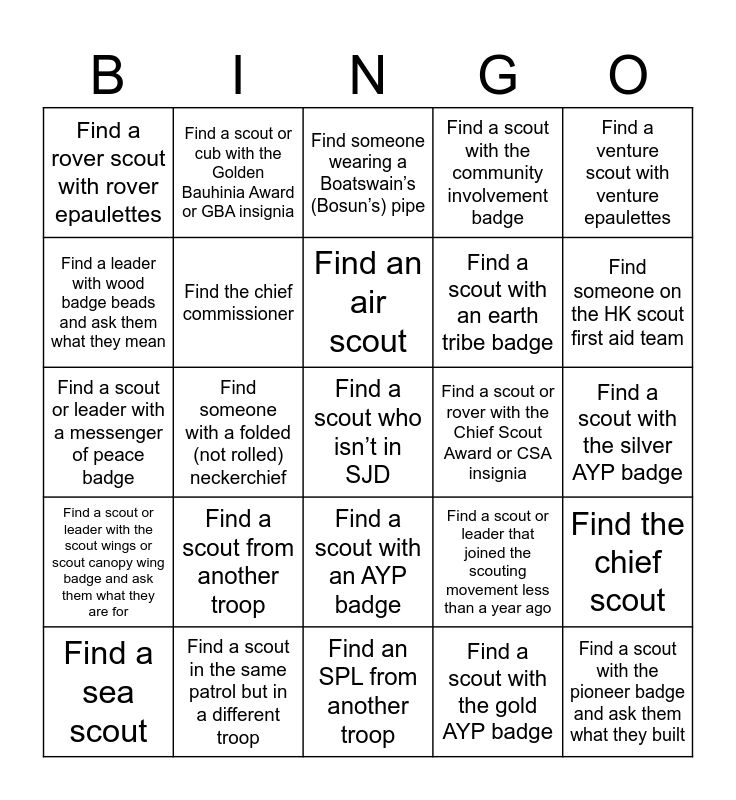 This bingo card has 25 words: Find a scout from another troop, Find an SPL from another troop, Find an air scout, Find a sea scout, Find a venture scout with venture epaulettes, Find a rover scout with rover epaulettes, Find a leader with wood badge beads and ask them what they mean, Find a scout or cub with the Golden Bauhinia Award or GBA insignia, Find a scout or rover with the Chief Scout Award or CSA insignia, Find a scout with an AYP badge, Find a scout with an earth tribe badge, Find a scout or leader with a messenger of peace badge, Find a scout or leader that joined the scouting movement less than a year ago, Find the chief scout, Find the chief commissioner, Find a scout with the pioneer badge and ask them what they built, Find a scout with the silver AYP badge, Find someone wearing a Boatswain’s (Bosun’s) pipe, Find someone on the HK scout first aid team, Find someone with a folded (not rolled) neckerchief, Find a scout who isn’t in SJD, Find a scout in the same patrol but in a different troop, Find a scout or leader with the scout wings or scout canopy wing badge and ask them what they are for, Find a scout with the community involvement badge and Find a scout with the gold AYP badge.