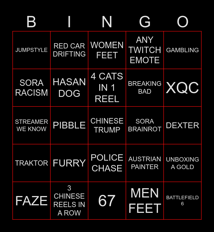 This bingo card has a free space and 24 words: FURRY, 3 CHINESE REELS IN A ROW, 4 CATS IN 1 REEL, FAZE, GAMBLING, JUMPSTYLE, SORA RACISM, RED CAR DRIFTING, SORA BRAINROT, POLICE CHASE, BREAKING BAD, STREAMER WE KNOW, AUSTRIAN PAINTER, UNBOXING A GOLD, HASAN DOG, MEN FEET, DEXTER, WOMEN FEET, XQC, PIBBLE, BATTLEFIELD 6, TRAKTOR, ANY TWITCH EMOTE and 67.