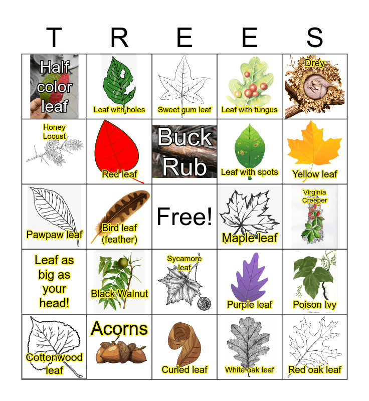 This bingo card has 23 images, a free space and 24 words: Black Walnut, Acorns, Buck Rub, Cottonwood leaf, Drey, Half color leaf, Honey Locust, Leaf with holes, Maple leaf, Sycamore leaf, Leaf with spots, Pawpaw leaf, Purple leaf, Poison Ivy, Red leaf, White oak leaf, Virginia Creeper, Sweet gum leaf, Yellow leaf, Bird leaf (feather), Red oak leaf, Leaf as big as your head!, Leaf with fungus and Curled leaf.