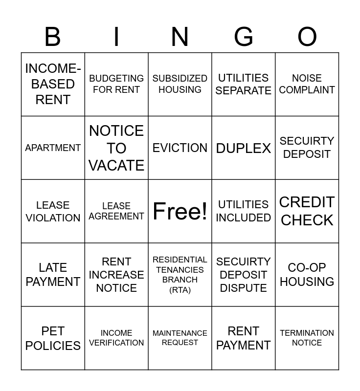 This bingo card has a free space and 29 words: PET POLICIES, CONDITION REPORT, LEASE AGREEMENT, RENTER'S INSURANCE, INCOME-BASED RENT, SUBSIDIZED HOUSING, NOTICE TO VACATE, RENT INCREASE NOTICE, UTILITIES INCLUDED, INCOME VERIFICATION, CREDIT CHECK, TERMINATION NOTICE, MAINTENANCE REQUEST, RENT PAYMENT, SECUIRTY DEPOSIT, RIGHT TO PRIVACY, RESIDENTIAL TENANCIES BRANCH (RTA), LATE PAYMENT, NOISE COMPLAINT, LEASE VIOLATION, SECUIRTY DEPOSIT DISPUTE, WALK-THROUGH INSPECTION, DUPLEX, APARTMENT, UTILITIES SEPARATE, BUDGETING FOR RENT, CO-OP HOUSING, EVICTION and LANDLORD ENTRY NOTICE.