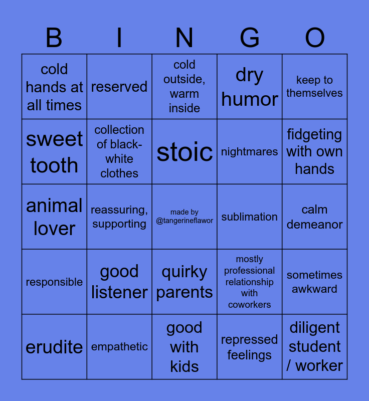 This bingo card has a free space and 24 words: good listener, empathetic, stoic, erudite, keep to themselves, cold hands at all times, sweet tooth, reserved, sublimation, quirky parents, nightmares, animal lover, mostly professional relationship with coworkers, sometimes awkward, collection of black-white clothes, repressed feelings, calm demeanor, cold outside, warm inside, fidgeting with own hands, reassuring, supporting, diligent student / worker, responsible, dry humor and good with kids.