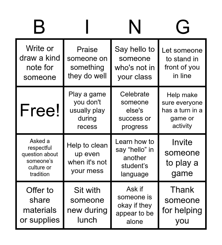 This bingo card has 16 words: Sit with someone new during lunch, Invite someone to play a game, Say hello to someone who's not in your class, Write or draw a kind note for someone, Asked a respectful question about someone’s culture or tradition, Praise someone on something they do well, Learn how to say “hello” in another student’s language, Ask if someone is okay if they appear to be alone, Free!, Play a game you don't usually play during recess, Offer to share materials or supplies, Let someone to stand in front of you in line, Help to clean up even when it's not your mess, Help make sure everyone has a turn in a game or activity, Celebrate someone else's success or progress and Thank someone for helping you.