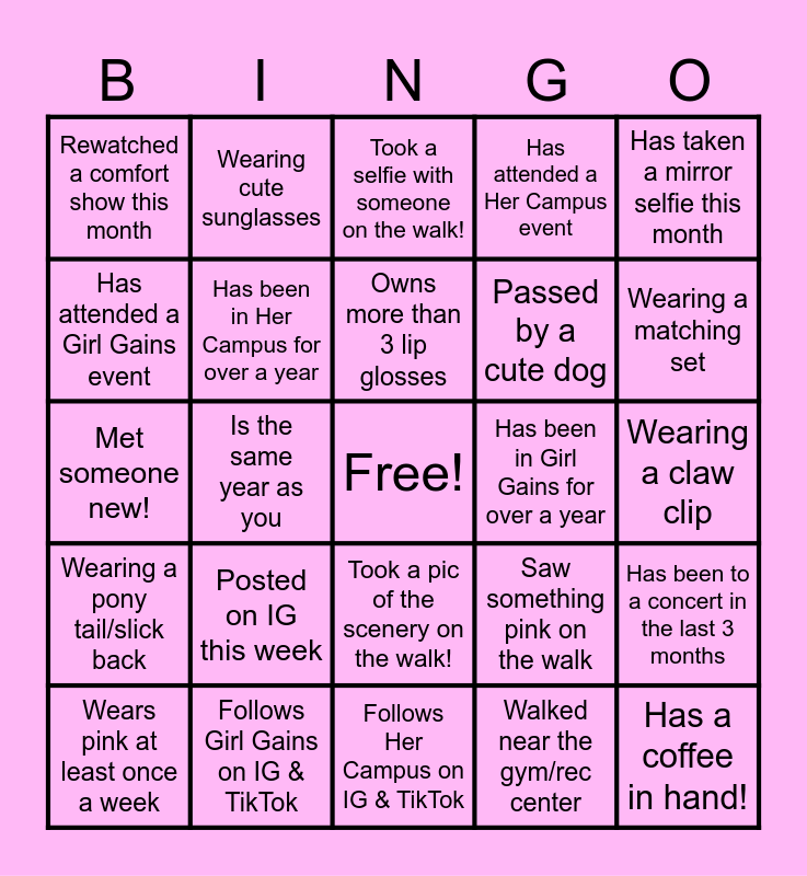 This bingo card has a free space and 24 words: Posted on IG this week, Follows Girl Gains on IG & TikTok, Owns more than 3 lip glosses, Wears pink at least once a week, Has taken a mirror selfie this month, Rewatched a comfort show this month, Has attended a Girl Gains event, Wearing cute sunglasses, Has been in Girl Gains for over a year, Took a pic of the scenery on the walk!, Passed by a cute dog, Met someone new!, Saw something pink on the walk, Has been to a concert in the last 3 months, Has been in Her Campus for over a year, Walked near the gym/rec center, Wearing a claw clip, Took a selfie with someone on the walk!, Wearing a matching set, Is the same year as you, Has a coffee in hand!, Wearing a pony tail/slick back, Has attended a Her Campus event and Follows Her Campus on IG & TikTok.