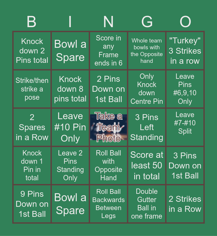 This bingo card has a free space and 29 words: Bowl a Strike, Bowl a Spare, Score in any Frame ends in 6, Gutter Ball on Left Side, "Turkey" 3 Strikes in a row, Knock down 2 Pins total, Knock down 8 pins total, 2 Pins Down on 1st Ball, 3 Pins Left Standing, 3 Pins Down on 1st Ball, 9 Pins Down on 1st Ball, Leave #10 Pin Only, Double Gutter Ball in one frame, 2 Strikes in a Row, 2 Spares in a Row, Gutter Ball on Right Side, Roll Ball Backwards Between Legs, Score at least 50 in total, Leave Pins #6,9,10 Only, Knock down 1 Pin in total, Leave 2 Pins Standing Only, Leave Front Pin Standing, Only Knock down Centre Pin, Leave #7-#10 Split, Strike/then strike a pose, Bowl a Spare, Roll Ball with Opposite Hand, Whole team bowls with the Opposite hand and Leave #7 Pin only.