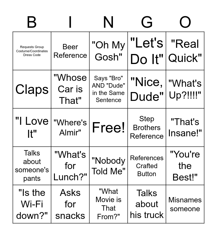 This bingo card has a free space and 24 words: "What's for Lunch?", Asks for snacks, Says "Bro" AND "Dude" in the Same Sentence, "Is the Wi-Fi down?", "Real Quick", Requests Group Costume/Coordinates Dress Code, Claps, Beer Reference, Step Brothers Reference, "Nobody Told Me", "Nice, Dude", "I Love It", References Crafted Button, "You're the Best!", "Whose Car is That", Talks about his truck, "That's Insane!", "Oh My Gosh", "What's Up?!!!!", "Where's Almir", Misnames someone, Talks about someone's pants, "Let's Do It" and "What Movie is That From?".