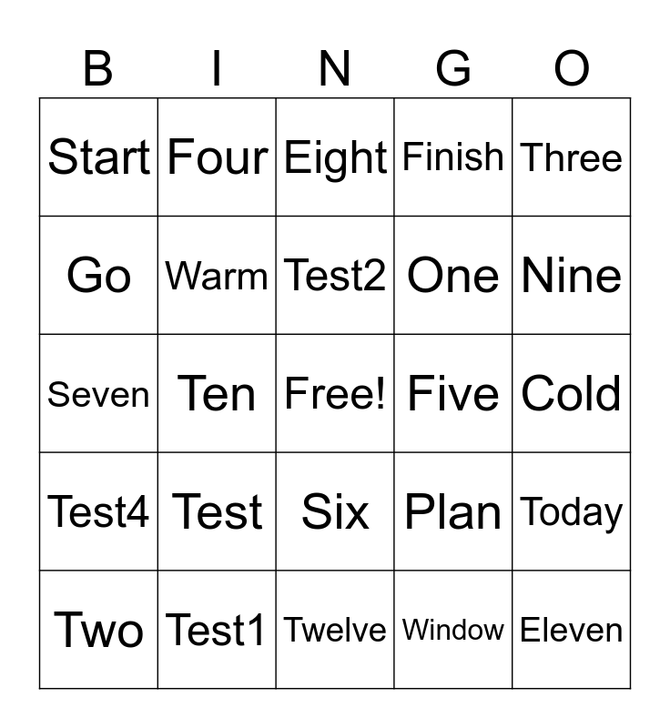 This bingo card has a free space and 24 words: Test, Test1, Test2, Two, Three, Start, Go, Four, Five, Six, One, Seven, Plan, Today, Warm, Window, Cold, Eight, Nine, Ten, Eleven, Test4, Finish and Twelve.