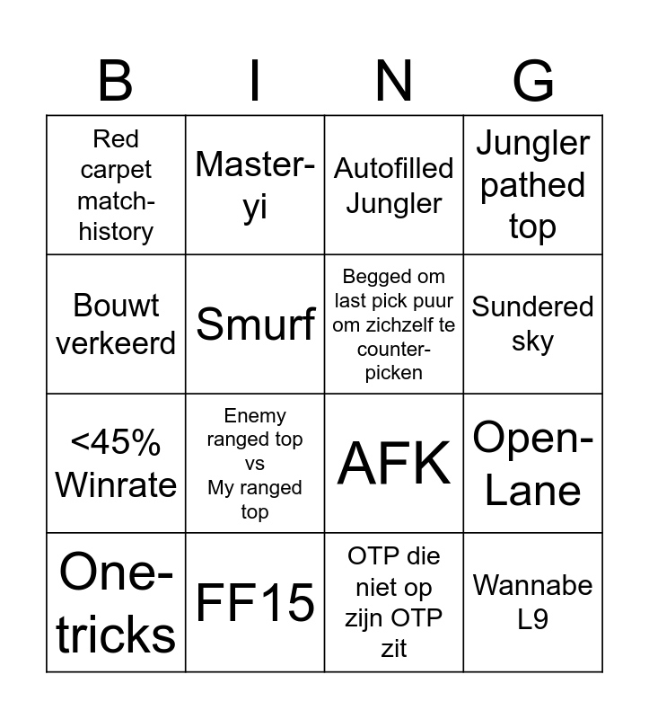 This bingo card has 16 words: FF15, Open- Lane, Autofilled Jungler, Red carpet match- history, <45% Winrate, Master-yi, AFK, OTP die niet op zijn OTP zit, Bouwt verkeerd, Smurf, One-tricks, Jungler pathed top, Enemy ranged top vs My ranged top, Sundered sky, Begged om last pick puur om zichzelf te counter-picken and Wannabe L9.